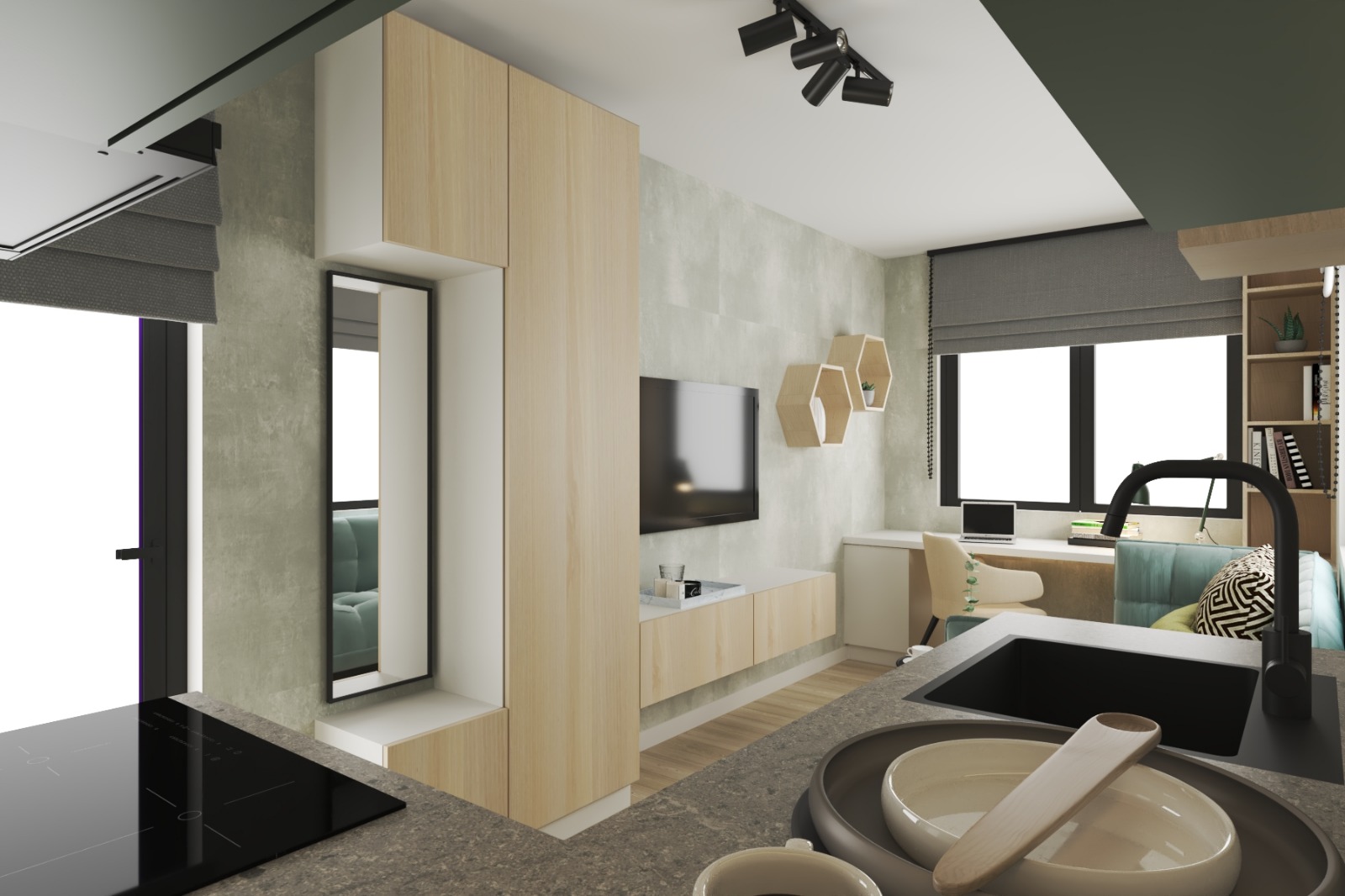 Bucătăria compactă, cu fronturi verzi și blat texturat, oferă tot ceea ce este necesar pentru gătitul de zi cu zi, într-un cadru coerent și bine proporționat. Elementele din lemn aduc căldură, iar rafturile hexagonale din zonă devin piese decorative care personalizează atmosfera.